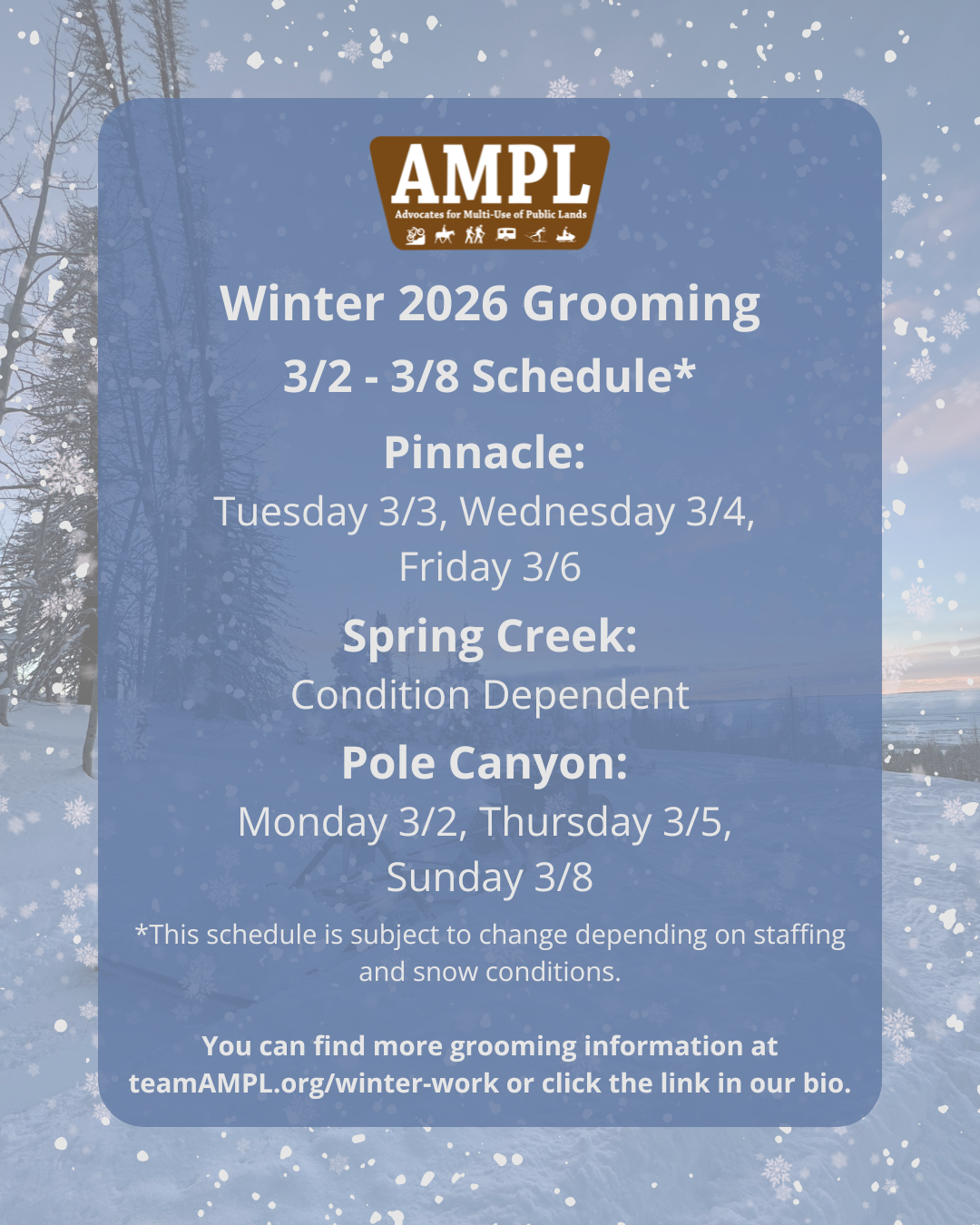 Grooming of Pinnacle and Spring Creek is made possible through grant funding from Wyoming State Trails. AMPL is so grateful for their support!